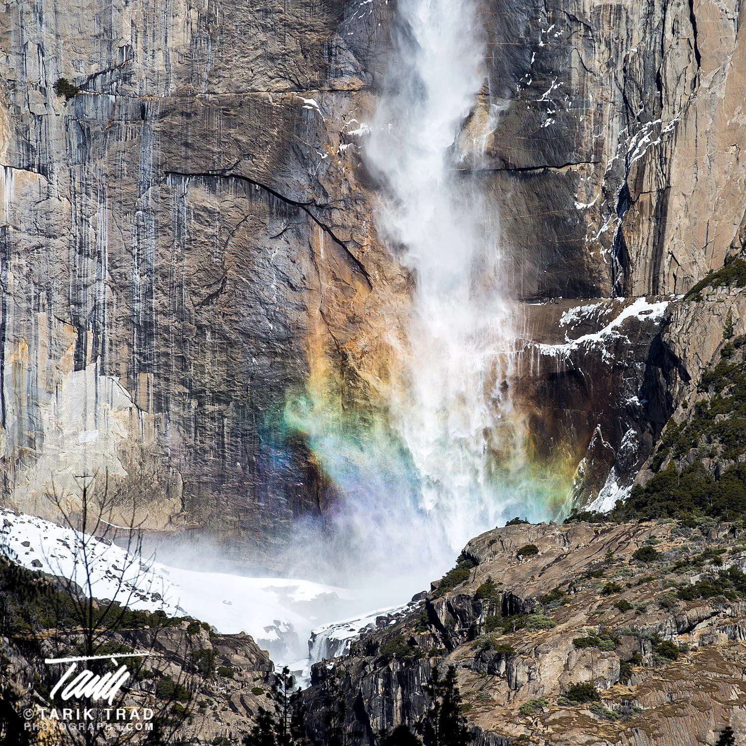 Luckily, I brought along a long telephoto lens which allowed me to capture some details of Yosemite Falls that I wouldn't normally get to see, including a rainbow that occurs when the falling water retracts off an ice dome that forms at the base of the upper falls during the winter.